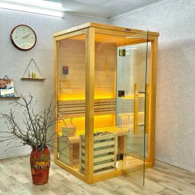 – Đá sauna chất lượng, xô/gáo gỗ, đèn chịu nhiệt, bảng điều khiển hiển thị nhiệt độ/độ ẩm.